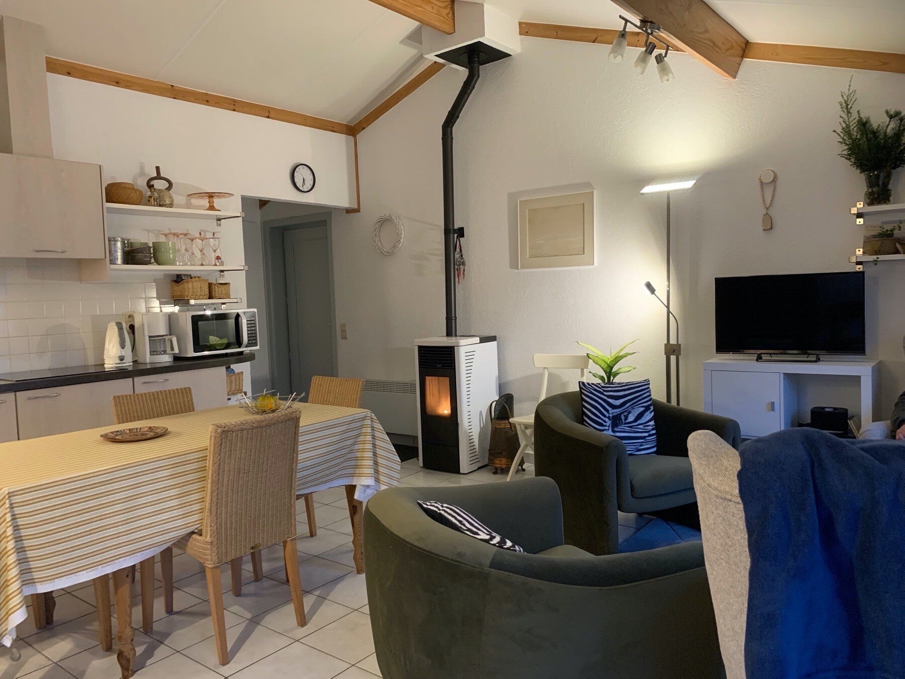 Er is een zithoek met vier zetels salontafel en tv-meubel met digitale Telenet-TV. Een blu-rayspeler is gekoppeld. Er is momenteel geen actieve internetaansluiting.
